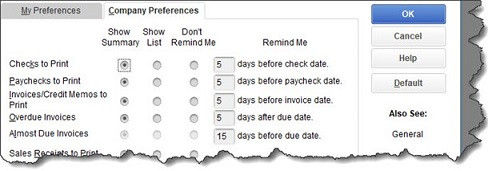 Turning on the Reminders tool in QuickBooks can help keep you current on bills, invoices, and other critical tasks. Open the Edit menu and click Preferences. Click Reminders and make sure the box is checked under the My Preferences tab so Reminders will open every time you run QuickBooks. Click Company Preferences and tell QuickBooks which reminders you want to see and when.